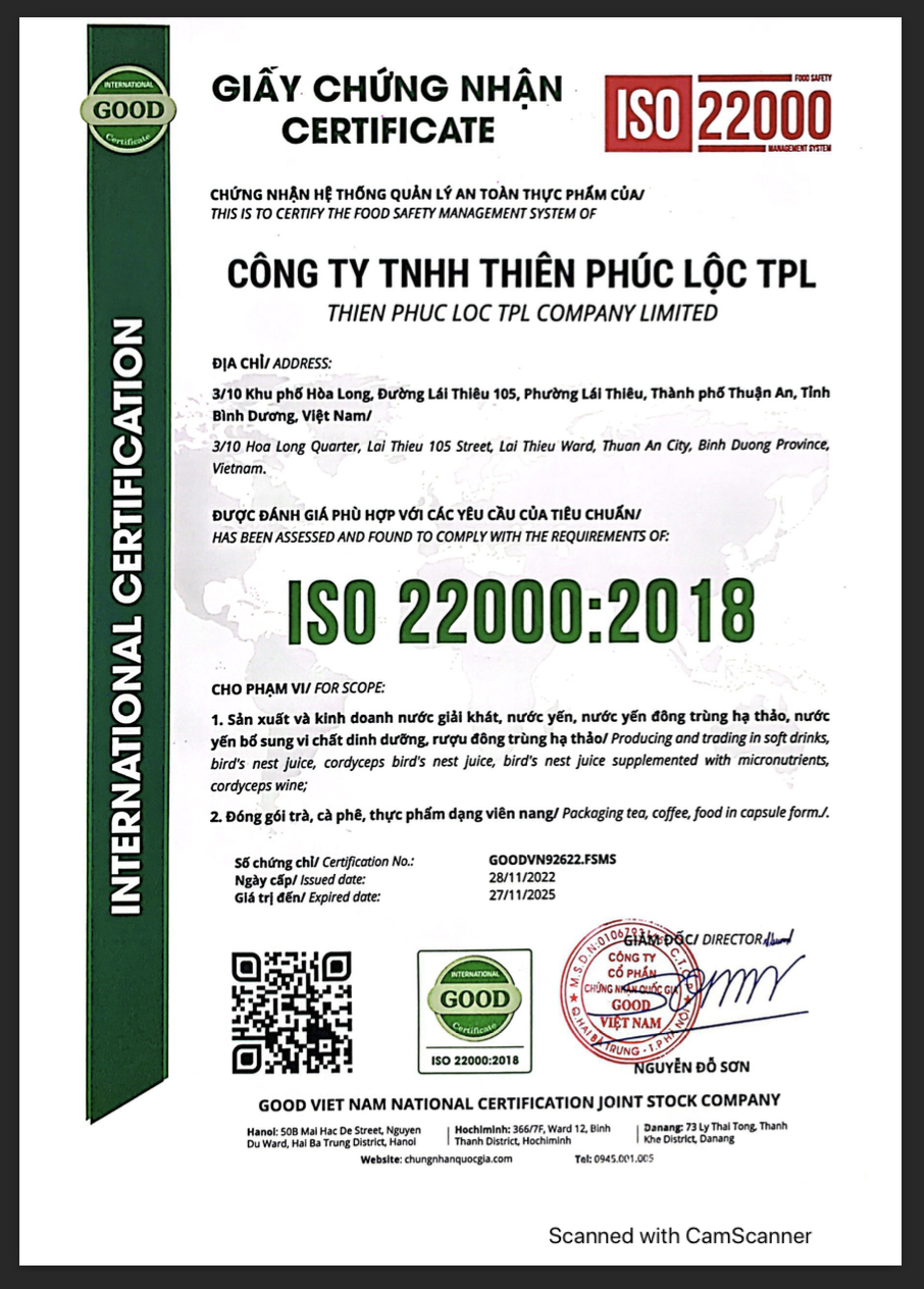 - Giấy chứng nhận cơ sở đủ điều kiện an toàn thực phẩm: Được cấp bởi Bộ Y tế, chứng nhận cơ sở vật chất, trang thiết bị, quy trình sản xuất và con người của chúng tôi đều đáp ứng đầy đủ các tiêu chuẩn nghiêm ngặt về vệ sinh an toàn thực phẩm.